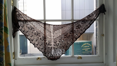 | Spring Festival shawl blocking in the window of our room in Edinburgh |